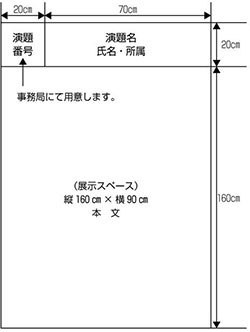 ※左上に20 ㎝×20 ㎝の演題番号が入ります(演題番号は事務局側で用意します)。※下の方は見えにくくなりますので、縦180㎝×横90 ㎝以内のサイズを推奨します。